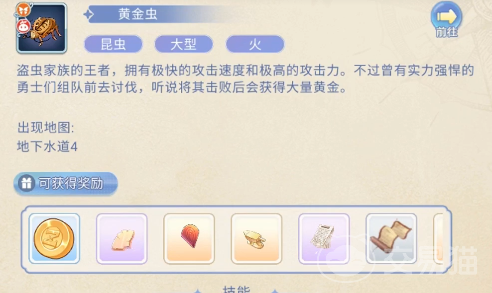 黄金虫本身的血量不是很低,它的防御力不高。但是攻速很快,本身的闪避很高,玩家们尽量使用技能来对付它。它会对玩家使用金钱攻击,火箭术,必中攻击等等,玩家们在前去狩猎之前需要做好准备。