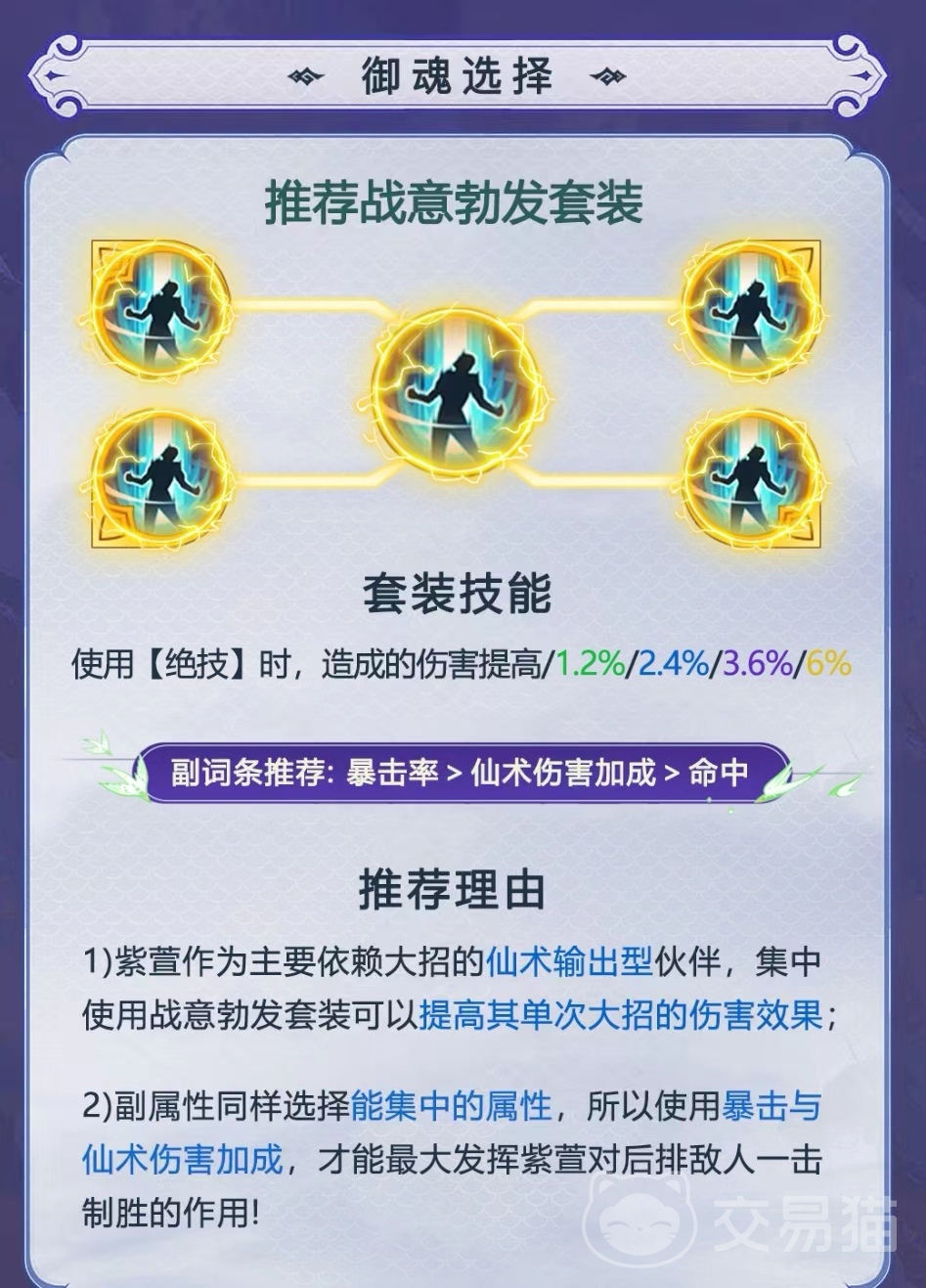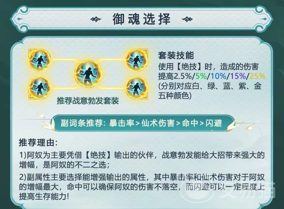 首先要知道游戏当中御魂的选择其实是多种多样的,这是因为游戏里面的定位角色的各种不同属性而特别设置的,让玩家们更好各方面的理解,其实可以根据角色的不同将它们大致分为输出型和辅助型的搭配角色,首先为大家讲解一下比较喜欢输出型角色适合搭配的御魂套装有哪些,在这里推荐玩家们选择战意勃发套装,战意勃发主要就是增加一个暴击的输出伤害,比较适合容易打出暴击的角色,例如阿奴和紫萱,装备上这样的话暴击率得到很大提高,输出能力的伤害也就会更高一些,同时暴击伤害也会得到更大的提高,它几乎适配于所有打暴击型输出的角色。