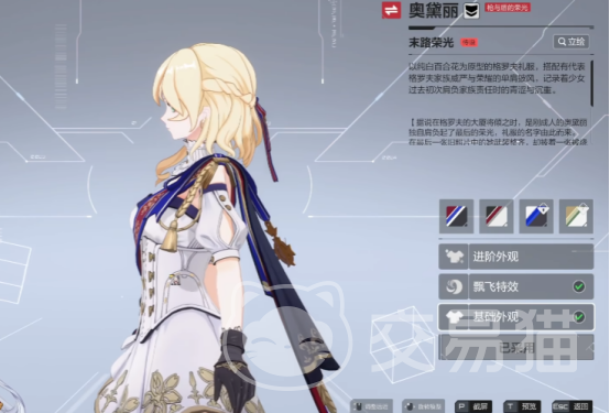 在红色的这款皮肤外形中就可以看得出来,当奥黛丽穿上这一款衣服时非常炫酷。这款皮肤叫末路荣光,真是皮肤如名字一样,上半身是一件礼服,下面搭配了一个长筒靴子,整体外观来看还是非常好的。当奥黛丽穿上这一身皮肤之后,显得整个人物非常高挺。