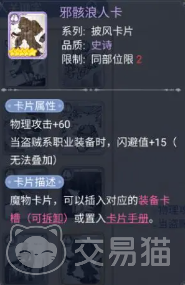 邪骸浪人卡:提供物理攻击加成。当刺客装备这张卡片时候,额外获得15点闪避值。