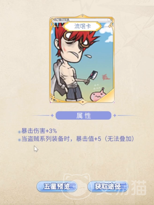 流氓卡片:暴击伤害加3%,盗贼装备该卡片时暴击值额外增加5。