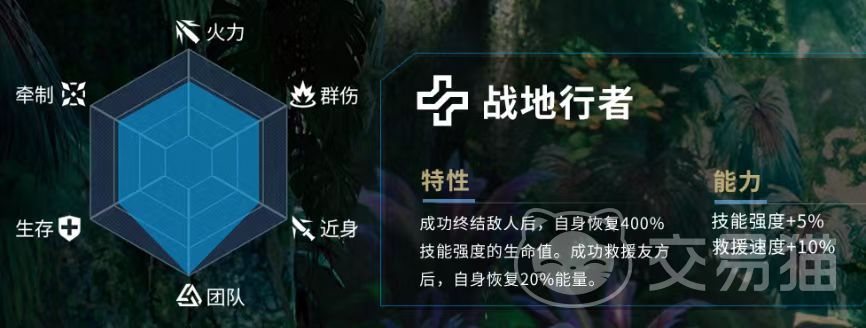 战斗中自身拥有独特的特性和能力,其中特性效果是在成功终结敌人后,将会恢复大量生命值,按照自身技能强度400%进行计算。当成功救援友方后,自身还能恢复20%能量,相信大家在体验过多人模式之后就会对战地行者的救人很感兴趣。另外还拥有能力,增加5%技能强度和10%救援速度,救援速度的提升在很多时候显得非常重要,快速将队友拉起来,可以防止对方过来补刀。