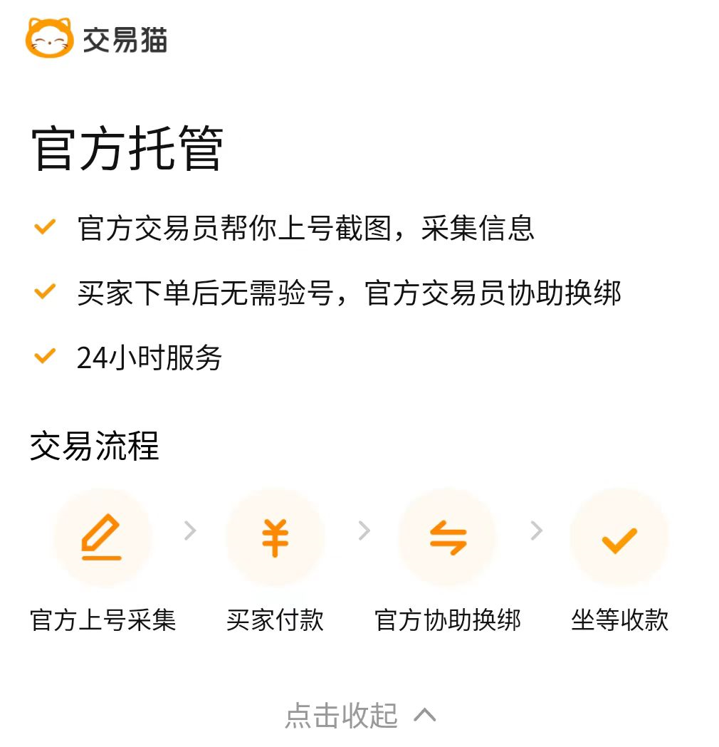 不仅如此,在交易猫平台注册成为一个卖家,相较于市面上的其他平台要远远的轻松许多,并且平台还提供了诸多的服务功能,有了这些功能卖家们就可以更加轻松便捷的发布自己的商品账号。就比如平台推出的托管类服务,他就能够帮助卖家们节约大部分的时间和繁杂的操作流程。有关于账号的需要发布的详细信息,图片采集、内容描述等都可以交给官方的交易员来操作,直接解放我们的双手。此外,这样托管操作还有一个十分明显的好处,就是省略了卖家方面需要提供的第三方验号。因为这一步直接就由托管的平台工作人员直接接手并完成了。再加上其全天的24小时在线服务,能够满足大家随时随地发布商品账号的需求,十分贴心到位。