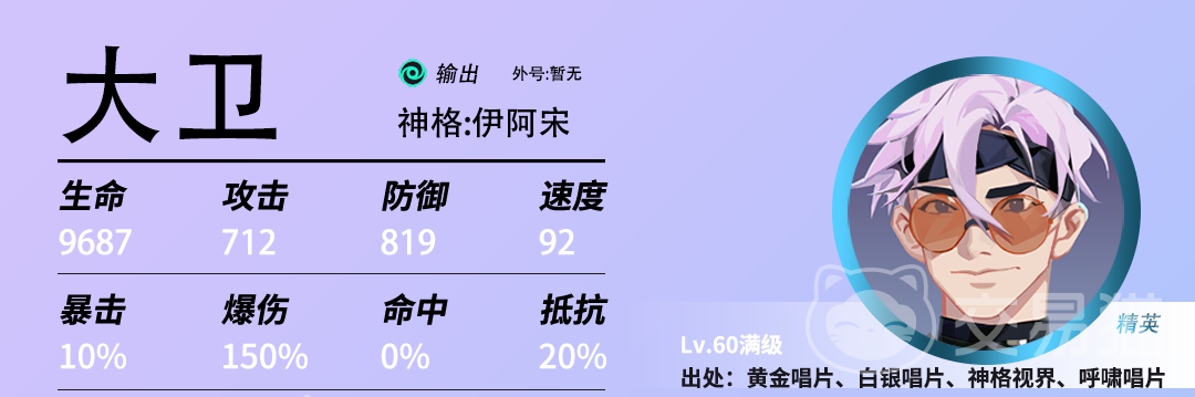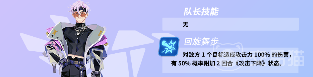 大卫不能作为队长,因为缺少队长技能,这也是三星角色的缺陷之处。第1个技能回旋舞步,攻击敌方一个目标,造成伤害后有百分之五十几率为其添加攻击下降状态,成功添加之后持续两个回合。削弱对方攻击在目前是很好用的状态,但因为攻击目标并不确定,所以存在一些不稳定因素,无法每次都削弱对方的核心输出。