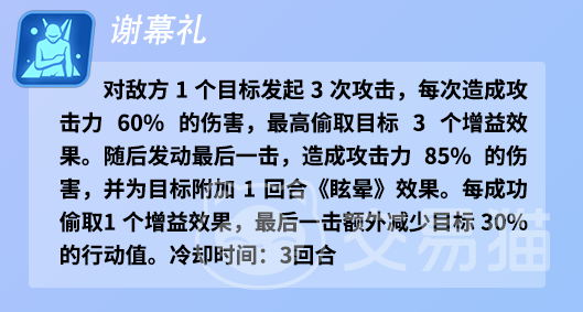 第2个技能谢幕礼,对敌方一个目标发起连续三次攻击,每次伤害虽然不高,但是可以偷取目标身上增益效果,最高偷取三个,之后发动最后一击,并为目标附加眩晕效果一回合。每次成功抽取到一个增益效果后,都会额外减少目标30%行动值,该技能冷却时间三回合。能够减少行动值是很多角色梦寐以求的技能,效果却在一个三星大卫身上出现,这样即使不对输出抱有希望,依然可以利用减少行动值的特点,很好的限制对方。