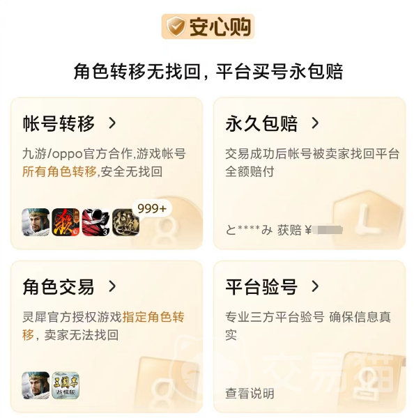 提到交易猫,相信许多人已经不再陌生了,因为它成立的时间非常久,在整个网络上都有着比较不错的名号,让许多的买家和卖家都愿意把自己第一次的交易在这个平台当中生产,并不是说它的广告宣传做得有多么好,而是它会真心实意地去将安全问题进行规避,首先,他能够做到推出“安心购”保险,虽然说,并不是百分百的账号都能够得到这一份保险,但也能够做到60%以上,买家要是选择了安心购就代表能得到一份无形的保障,不管是在找回包赔方面还是其他安全问题上。