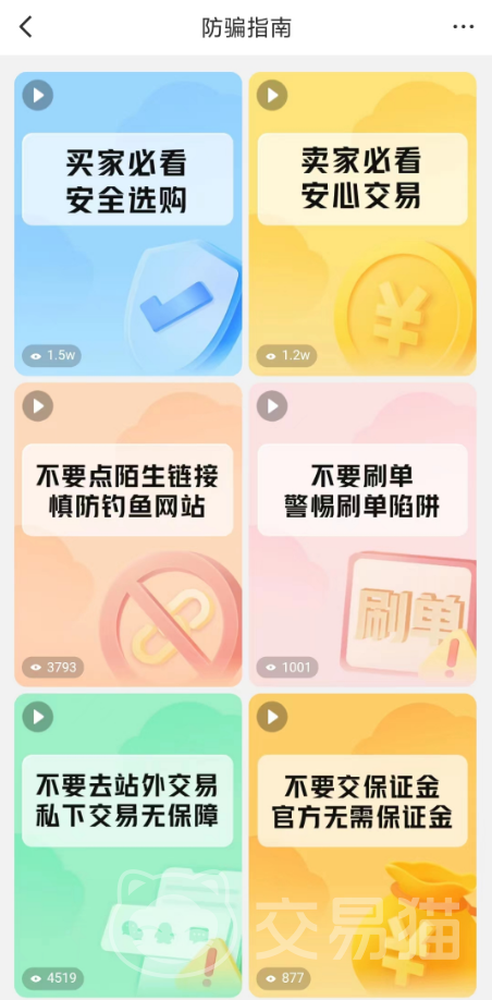 除了在实质性上开展工作之外,交易猫还十分看重,针对一些网络小白在安全防骗的问题上不够成熟,对此也是专门成立了安全中心来帮助买家进行防骗指南的学习,其实不管你是新手还是经常进行交易的老手,在这个安全中心当中都能够学到很多的知识。