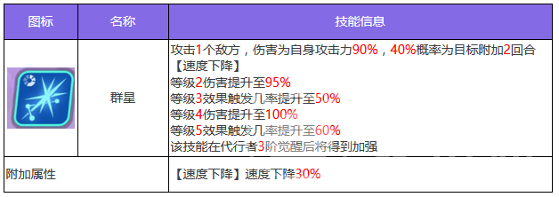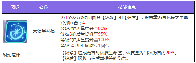 该角色的第1个技能群星,在攻击一个敌方目标后,有最多60%几率为其附加速度下降影响,持续两个回合。受到影响的敌方单位下降30%速度属性,在目前战斗过程中,速度下降也就意味着丧失率先出手机会,这对很多依靠先手的角色来说是很大的打击。技能天狼星祝福,为一个友方目标添加汲取和护盾效果,持续三个回合。