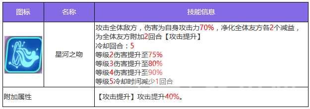 护盾按照目标最大生命值比例来计算,最多能达到100%,这样厚的护盾量能够承受很多次打击。汲取是在造成伤害时拥有吸血效果,当次造成伤害的20%转化成自身生命值,该技能全方位提高了友方单位续航能力,有护盾抵挡伤害,有吸血来自己恢复,很快就能将血量回满。第3个技能星河之吻,攻击目标变成敌方全体,虽然输出不高,但可以同时为我方全体添加净化效果,驱散身上两个减益状态,友方还能附加两回合攻击提升状态。