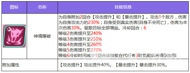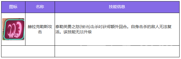 被动效果为赫拉克勒斯攻击,在击杀时自身获得额外回合,被泰勒所击杀的敌人无法进行复活。现在有辅助拥有复活技能,也有一些玩家走复活流派,但是面对泰勒这些统统失效。第3个技能神魂爆破,为自身添加两个回合攻击提升和暴击提升状态,攻击一个敌人造成高额单体伤害,自身同样会受到真实伤害,但不会因此而死亡。将目标身上全部增益效果驱散掉,提升技能等级后伤害值还能再有所增加,冷却回合也能降到五回合。