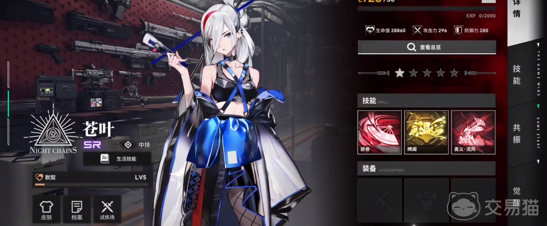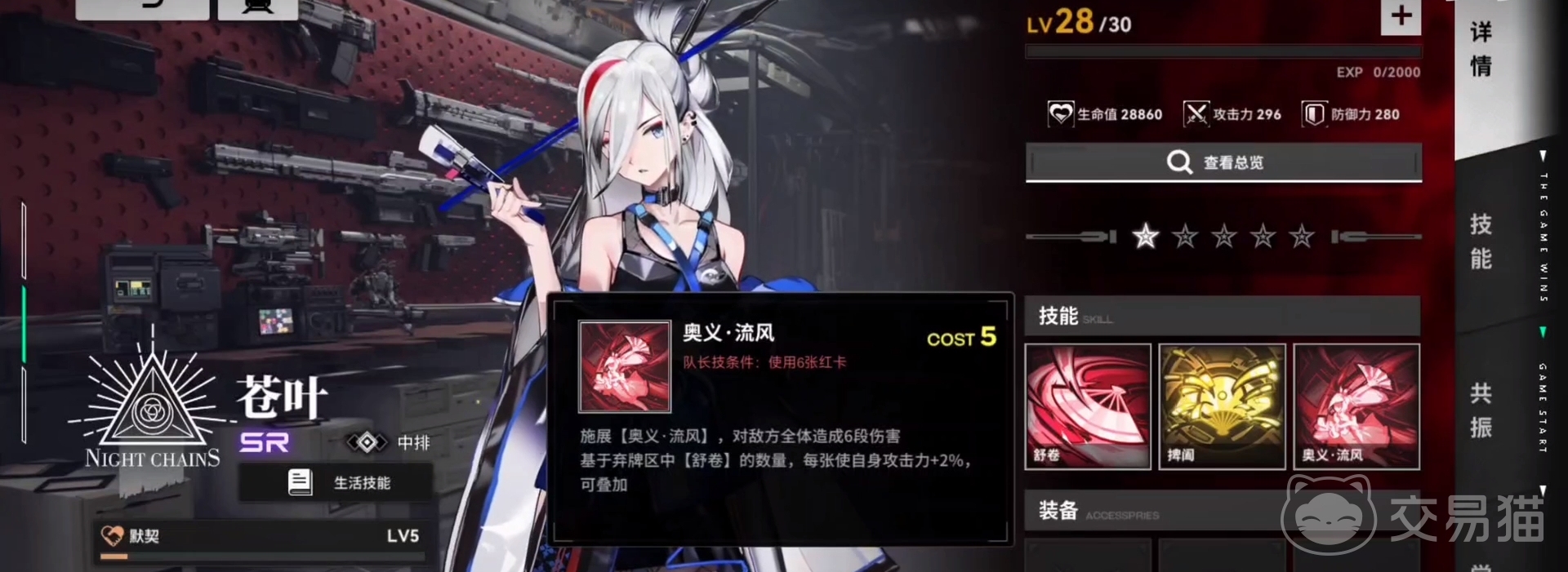 技能奥义流风。奥义流风是苍叶的队长技技能,只有当苍叶为队伍中的队长时才能发动,但它的伤害却非常的吸人眼球,可以打出六段并且弃牌堆中的舒卷可以进行叠加,每次叠加增加2%