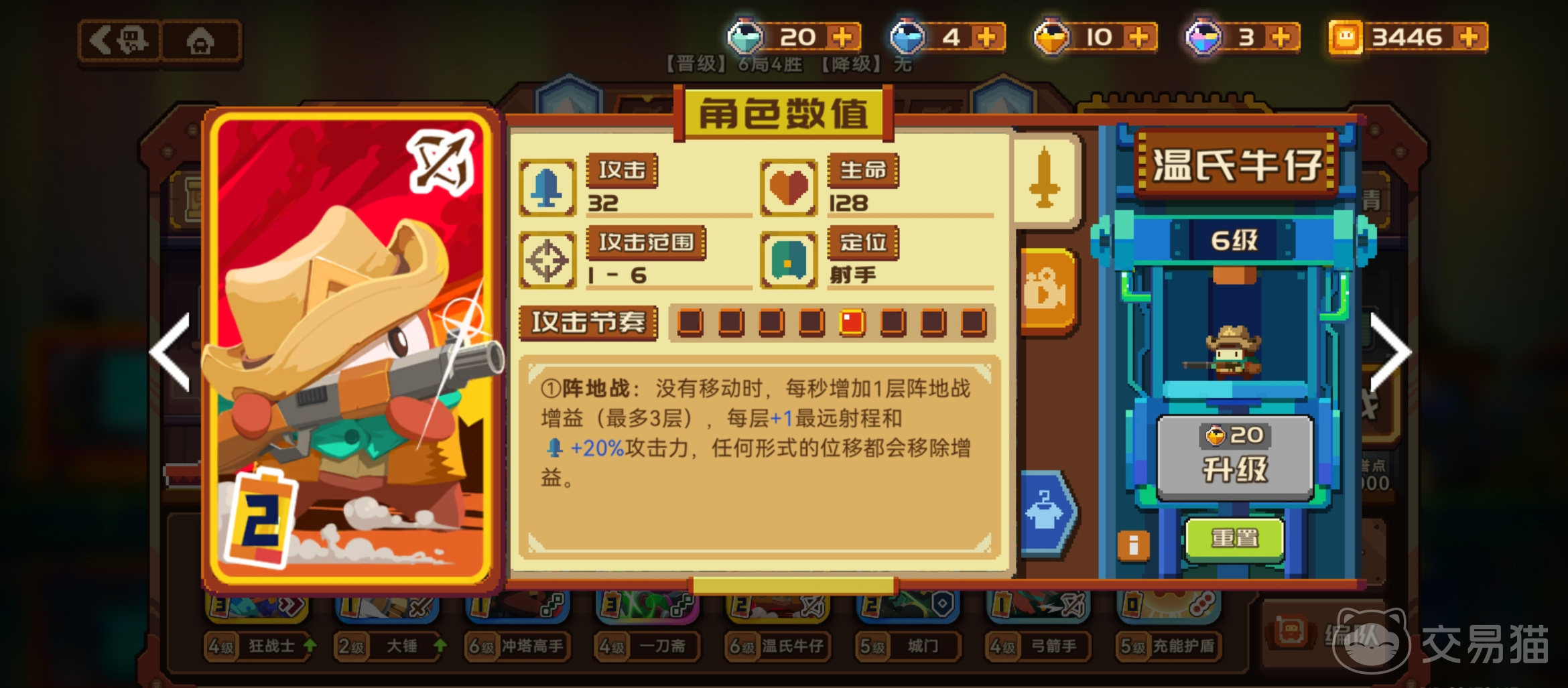 输出角色可以选择射手、斥候类卡牌,它们的技能可以解决敌方后排。如温氏牛仔、冲塔高手和一刀斋都是强度一直比较在线的角色,特别是温氏牛仔的超远攻击距离可以做到无伤点塔,在清理哨塔时非常实用。