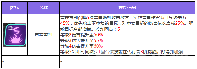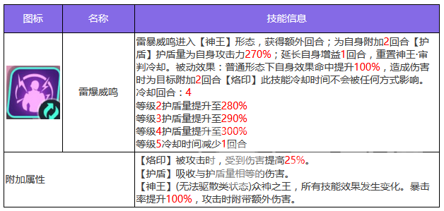 三个技能雷爆威鸣,使用之后进入到神王形态,能够变身也是宙斯很大特点,在变身之后获得额外回合,这在pve过程中绝对是有效的优势。同时自身附加护盾持续两个回合,自身攻击力越高,护盾越厚,还能延长身上所有增益效果一回合。在使用之后将雷霆审判技能冷却时间重置,此外该技能还有被动效果,普通形态下提高命中率,在造成伤害时为目标附加两回合烙印。凡是带有烙印的目标被攻击时受到伤害都会提升。