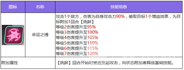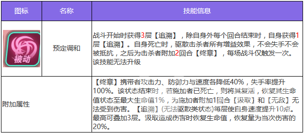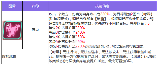 第2个技能预定调和,自战斗开始之后就能获得三层追溯效果,除自身每个回合之外,都能再获得一层追溯效果。在死亡之后,击杀者身上所有增益效果都会被清除,之后击杀者将会被附加上两回合终章影响,此技能战斗只能触发一次。附加的终章对携带者攻击力、防御和速度都会降低,并且100%提高失手率。第3个技能原点,输出敌方单体目标后,可以附加两回合时零状态,注意此状态对首领单位是无效的,将身上所有追溯状态消耗掉,消耗层数和命运支之缚追击目标相应次数相当。