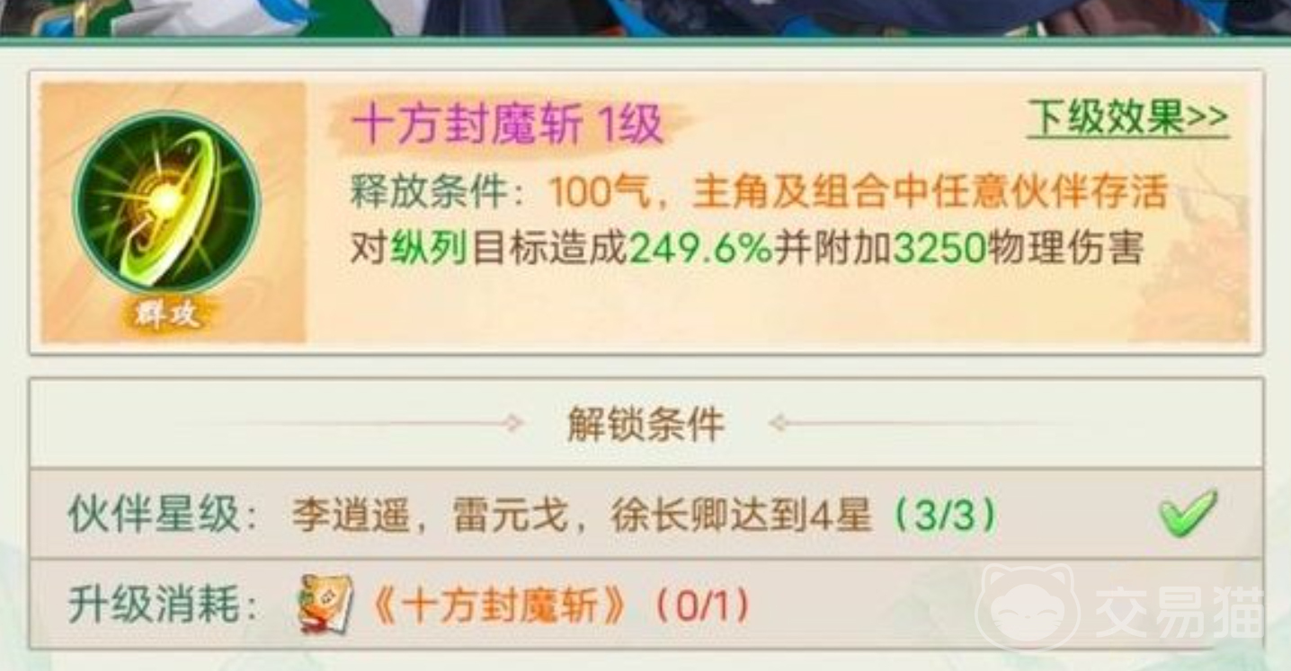 首先,想要获得该技能的话,先需要将李逍遥以及徐长卿,还有雷元戈等角色。并将等级拉到满星之后,才有条件获得这个技能。然后还需要前往九顶山,然后寻找到相关人物角色,并将你的道具馨香玉与还有射日弓,同时托付给他,就可以获得十字封魔斩的技能。