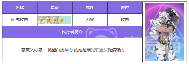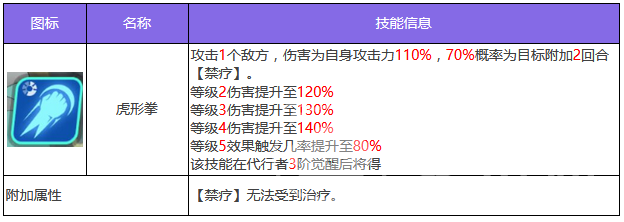 游戏中的老虎角色属于闪耀属性攻击角色,第1个技能虎形拳,选择一个敌方进行攻击,除了伤害之外,还有很高几率为目标附加禁疗效果,持续两个回合。通过提升技能等级效果,触发几率会得到提升,治疗是现在很有用的限制属性,对方辅助所进行的治疗,在遇到禁疗之后就失去了用武之地。