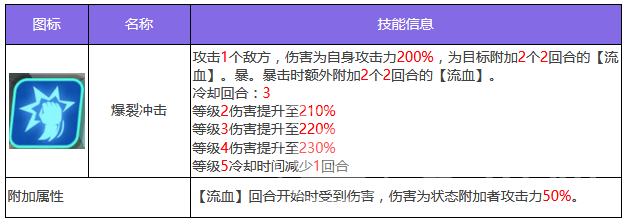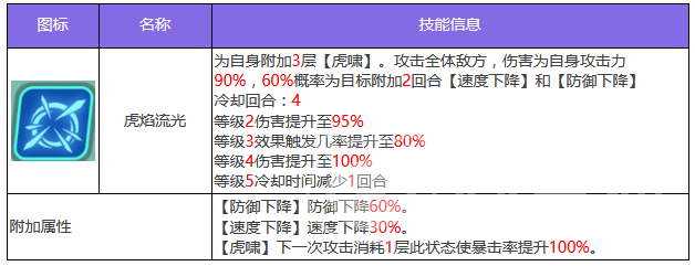 第2个技能爆裂冲击,攻击一个敌方目标为目标,可以附加持续两个回合流血状态,此状态一次性可附加两个。作为可叠加的状态,流血在每回合开始都会受到额外伤害,叠加起来伤害更加可观。第3个技能虎焰流光,使用之后为自身添加三层虎啸状态,攻击敌方全体目标,按照自身攻击力造成伤害,还有较高几率为目标附加防御下降和速度下降这两个状态。