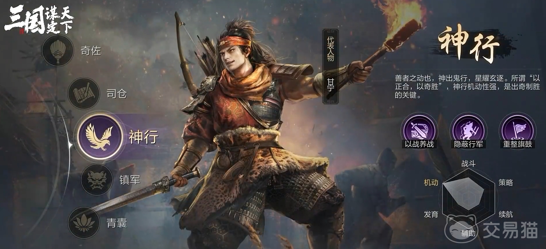 而神行,就是这种出奇制胜的奇兵职业。它的最大特点在于其高超的机动性以及速度加点效果,无论是在战场上侧面骚扰,亦或者是直插后方摧毁后勤,都是一把好手。可以快速的绕到后方,对其后勤单位造成毁灭性打击。