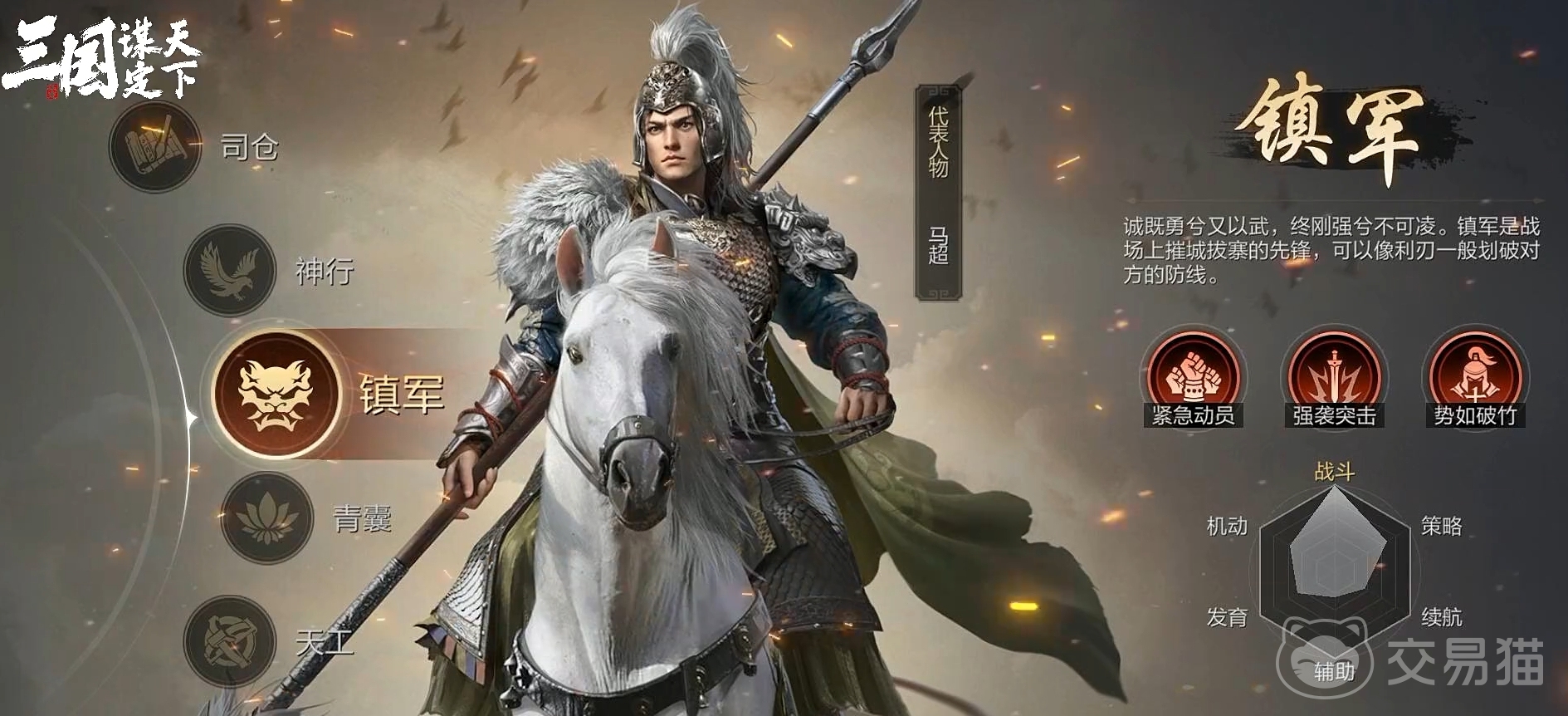 该职业最大的特点在于他是我们战场之上迎面对敌的最主要先锋,也是我们发起突破攻击的利刃,威风凛凛,让敌人望风而逃。在这个乱世之中,镇军是最能代表部队战斗力的职业,属性当中战斗力最高,且玩法方面非常具有侵略性,是我们攻城拔寨的主力。