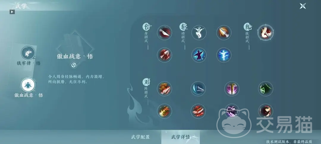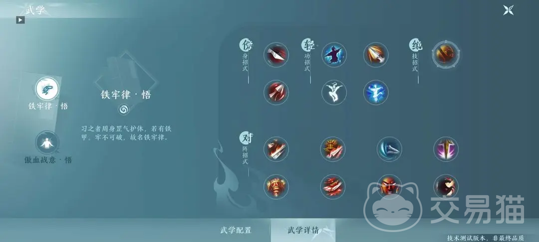 该职业有两种武学心法,不同的心法侧重点是不一样的,第一种是“傲血战意”,这是一种近战类型的外功,拥有别的门派没有的马上战斗的能力,是攻防兼备的一个心法,可以让自己在马上也游刃有余。第二个是“铁牢律”,这虽然也是一个近战的外功,但是主要侧重点是在防御方面,如果是副本当中,那么使用该心法的天策就会处于至关重要的防守位置了。而且在不断改进当中,该门派的战意设置也会比之前释放更加自由,对于技能的效果,还有战局观察方面更为侧重了。