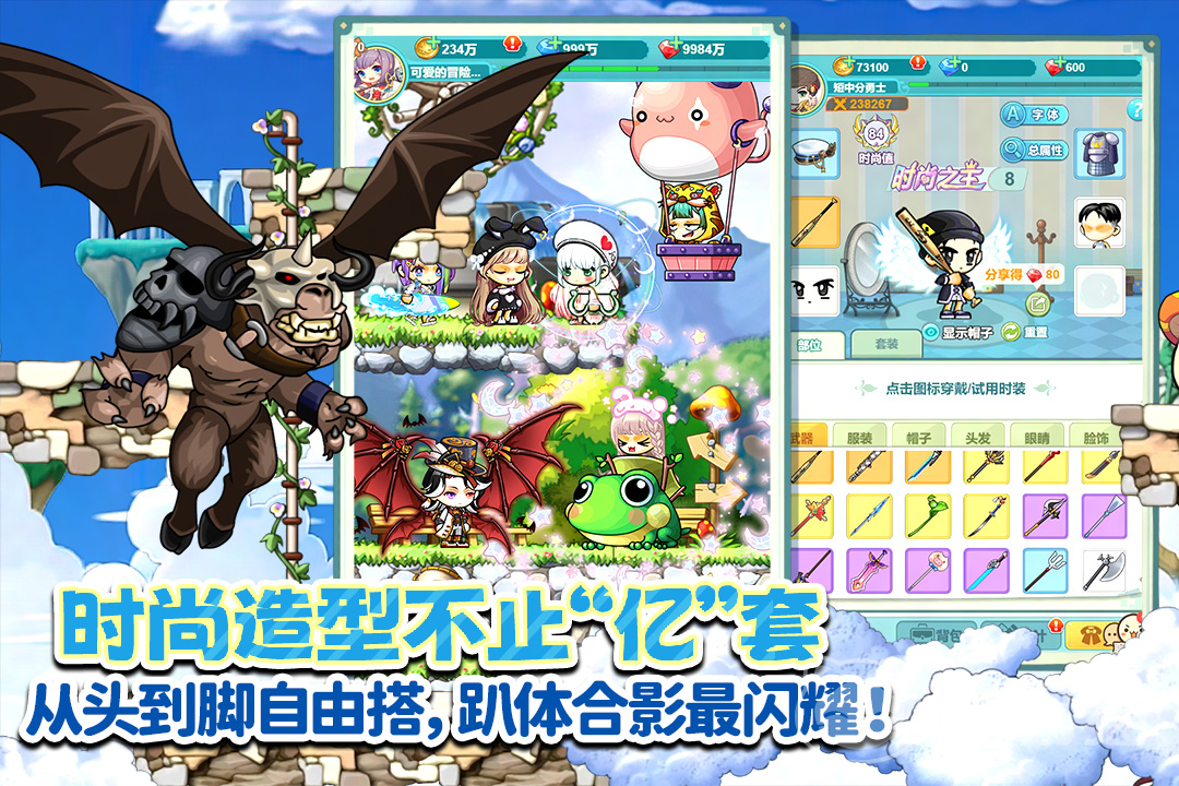 游戏里的装备总共有六件,通过野外打怪、挑战boss、商店兑换、打造都可以获取到,并且装备更换以后支持强化等级继承,材料和宝石通过日常活动就可以免费获得。游戏的时装也是五花八门非常好看,而且时装与数值之间不绑定,只要穿上时装就有数值加成,和穿戴的造型无关,让大家做最个性最靓的崽。
