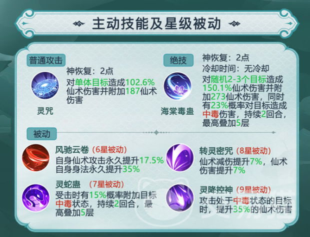 首先阿奴这个角色很容易获得,并且满级十星,她达到九星的升级速度也很快。到九星后她就会拥有一项被动技能,就是灵降控神。能对场面上敌方有中毒效果的敌人多造成百分之三十五的伤害。所以搭配上御灵蛊神的技能(能对大范围的敌人施加中毒效果),二者的配合能让团队输出更上一层阶梯。