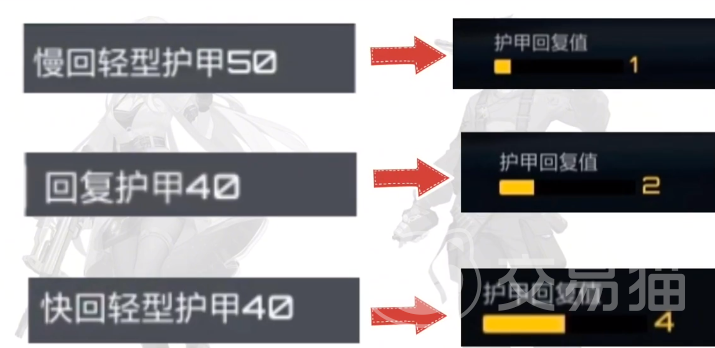 在游戏中,护甲主要有慢回轻型护甲、回复轻型护甲、快回轻型护甲以及回复护甲。这4种不一样的护甲,所拥有的效果会有所区别。