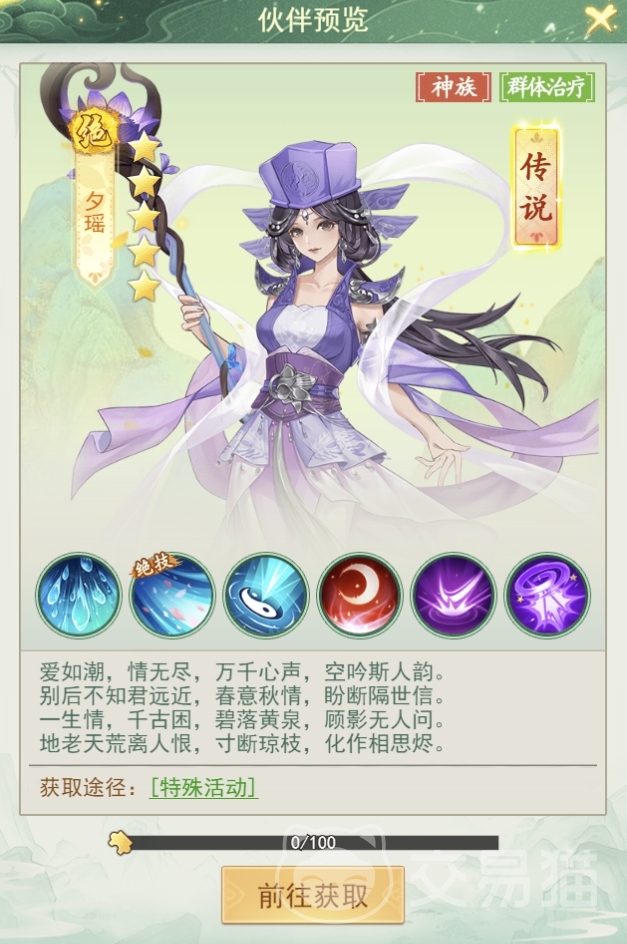然后来介绍下夕瑶。她是神族中人,在游戏中也属于传说级角色。同样的,她的游戏定位和柳梦璃一样,都是辅助,并且有着强大的治疗能力。其主动技能春兹万物除了能治疗队伍所有人外,还能提升团队所有人的输出能力,对团战有很大的帮助。