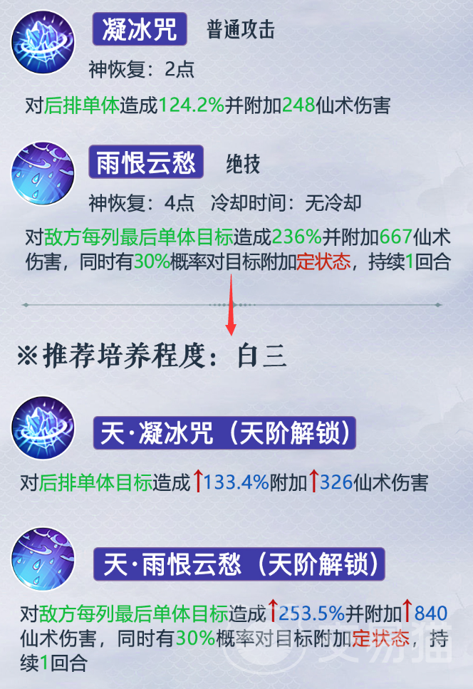 赵灵儿:觉醒后的技能是冰心之诀,可以对敌方全体造成伤害,并使敌方进入定状态,同时提升己方全体的hp和防御,持续两回合。李忆如:觉醒后的技能是天机之术,可以对敌方全体造成伤害,并使敌方进入眩晕状态,同时提升己方全体的攻击和命中,持续两回合。紫萱:觉醒后的技能是天雨恨云愁,可以对敌方全体造成伤害,定状态的概率及伤害都有所提升,持续两回合。
