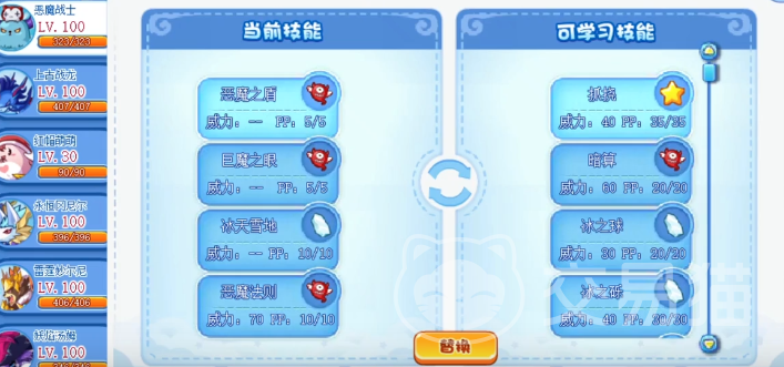 首先就是抓挠这个技能,这是恶魔战士的初始技能,并且所发出的也是物理攻击,可以给对手造成一定的伤害。接下来就是暗算这个技能,也能够去命中对方,威力能够达到60,比抓挠要高一些。冰之球是一个冰系的属性,在五回合之内会进行连续的攻击,并且威力将会一步一步的增加,如果并没有命中则会重新计算。小丑礼物是恶魔属性的,属于一个物理攻击,会带来强大的伤害。