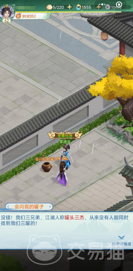 第三个罐子叫做罐头大哥,地图中显示的是会消失的罐子。也就是酒坛怪真身,它位于长安城的北城门,靠近城门口。你需要在晚上的时候进入北城门,然后在城门口附近寻找,你会发现一个黄色的罐子,和它对话,它会告诉你它的名字和它的两个哥哥的愿望,还会给你一本天雷滚滚作为奖励。完成整个罐子三杰还有300灵玉。