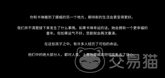 第一个结局是搬家,孩子在学校交到了朋友,但是也遇到了一些不开心的事情,由于孩子的身份较敏感这个设定,决定了他会在学校受到了不公正的对待,但是在种种不如意下,还是碰到了喜欢自己,能平等对待自己的老师,过了一段时间开心的日子,这时候玩家就需要耐心听她的情绪倾诉,因为好老师要离开的节点要到了,随着老师的离开,孩子情绪一天一不如一天,某一天他很晚回家,如果好感够高,他就会和玩家商量离开的事情,于是玩家决定带着孩子离开这个地方,在游戏的结尾,许诺和孩子去一个没有坏人的地方,孩子也对玩家放下心防,在树林边看了一眼来巡视的挪威国王之后,和孩子搬到另一个地方,期待着新的生活,这算是一个相对不错的结局。