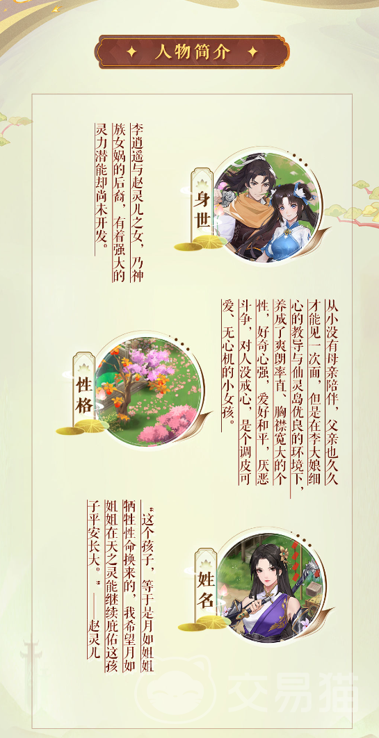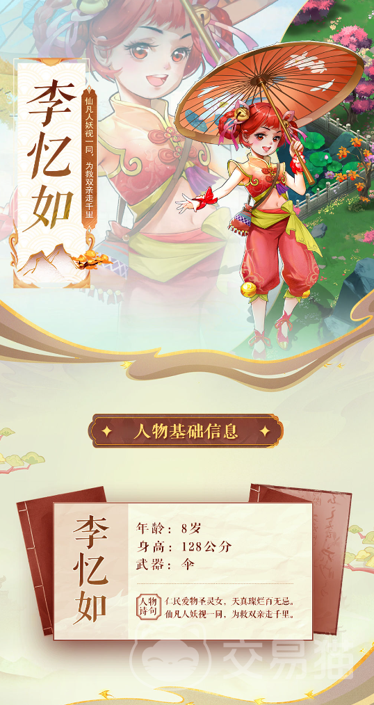 李忆如在仙剑奇侠传中是李逍遥和赵灵儿的女儿。游戏中她出场时只有八岁,天生拥有巨大的灵力天赋。性格上比较善良,古灵精怪,还精通五行御灵之处。李忆如本身拥有极高的仙缘天赋,她只需要利用灵力仙缘加29%再释放技能,就可以释放附带免疫的持续伤害。可以直接克制很多角色的攻击。
