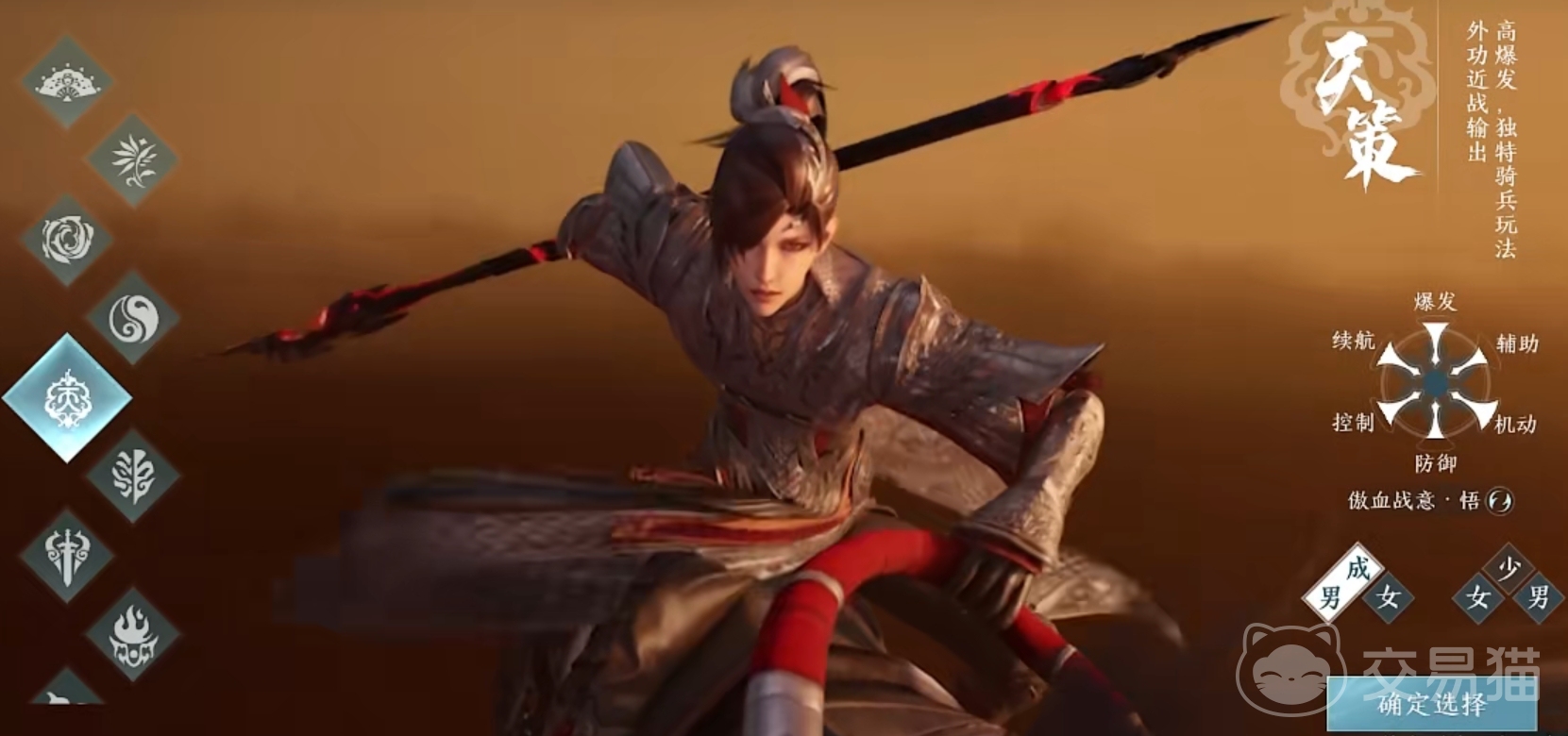 那么第二个便是我们的天策,是一个高爆发,带有齐拼单位的前排近战输出职业。不同于少林以团队辅助为主天策的整个职业搭配方面,更加倾向于一个突破和高机动进展。但本身防御不错,也可以作为前排单位扛伤,喜欢的玩家可以试一试。