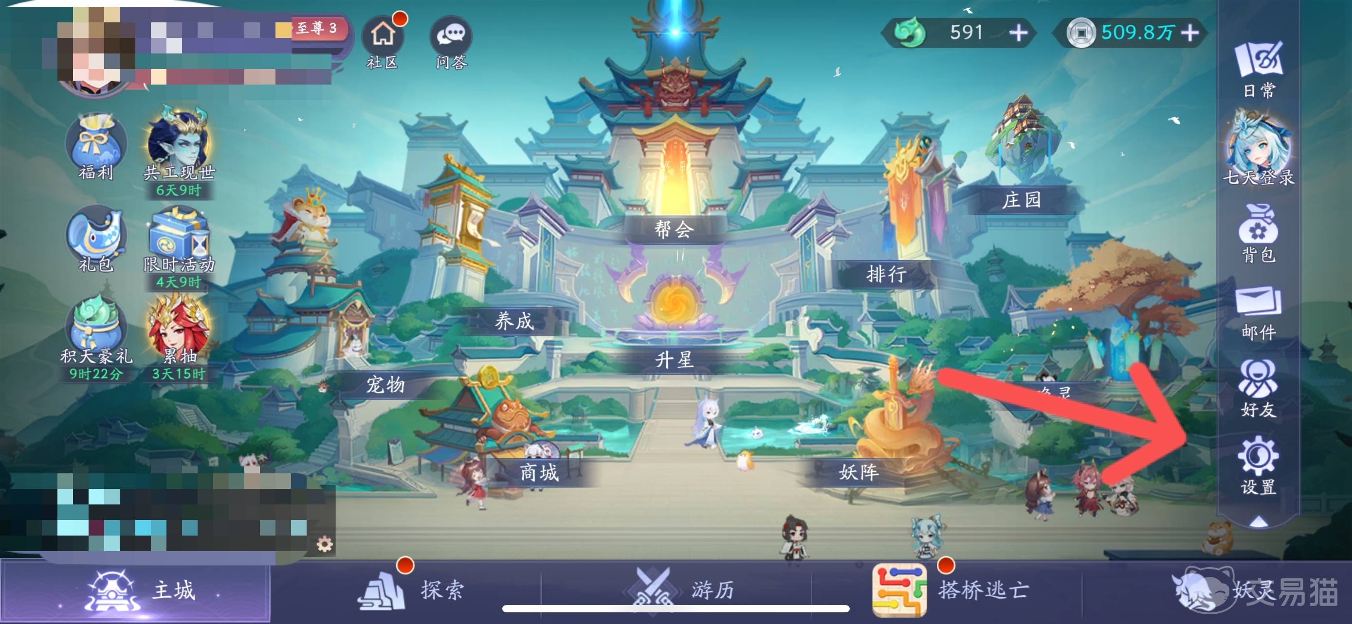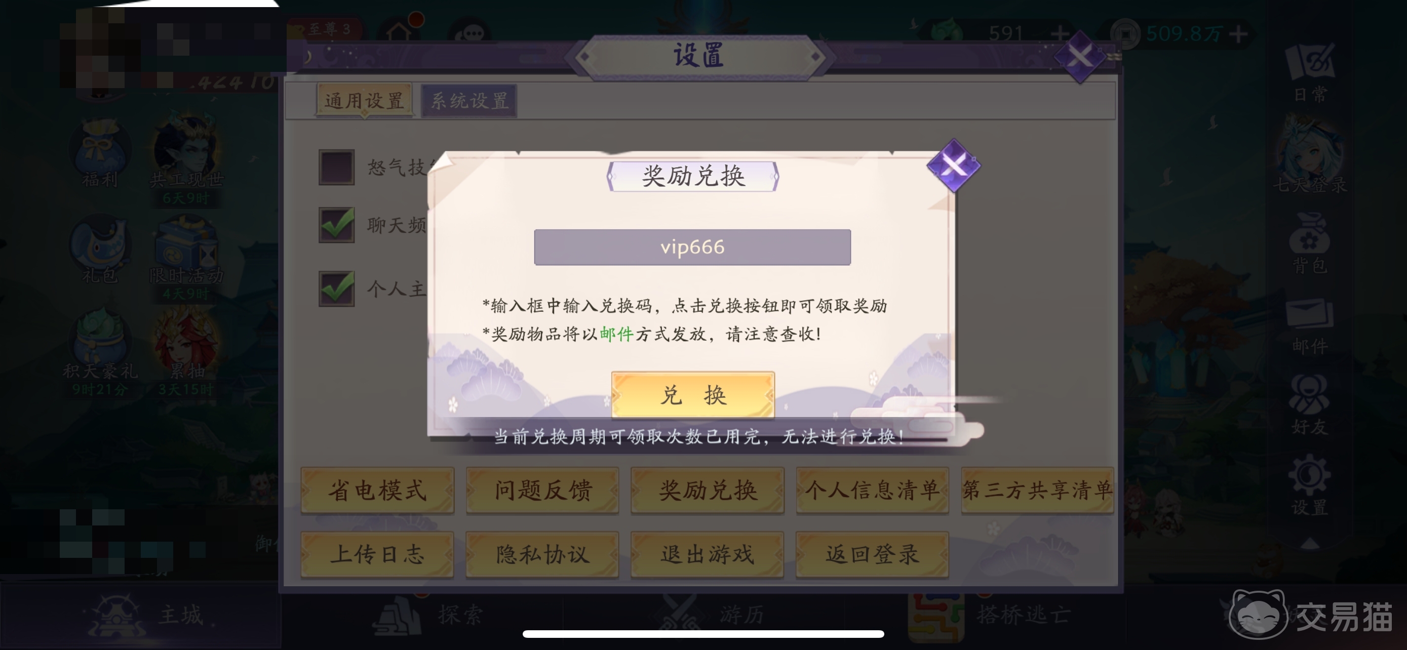 进入主城位置直接点击右下角的齿轮图标也就是设置按钮,切换为通用设置里面找到奖励兑换即可,注意兑换码奖励都是直接发送到邮件的,手动领取一下然后可以在背包里面使用。