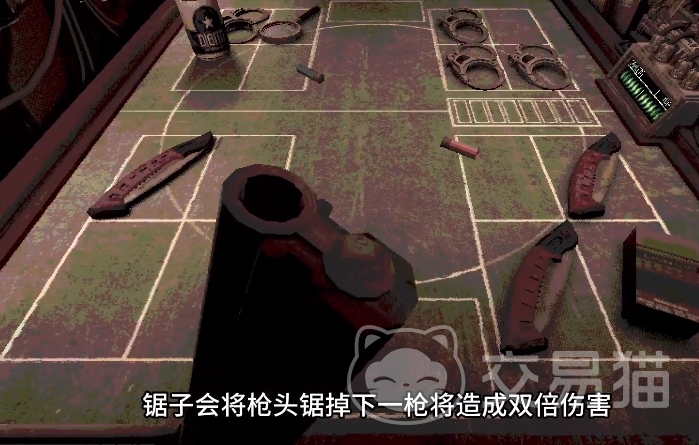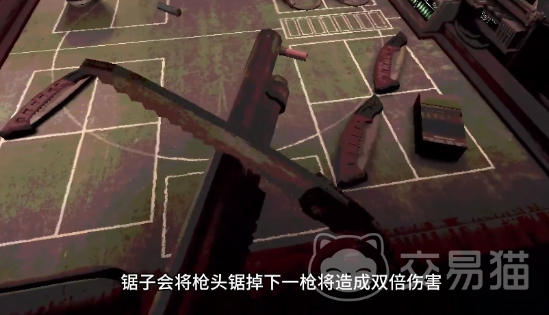游戏中能够增加扣血量的道具是锯子,不过首先需要你打到第二回之后才能解锁道具,使用锯子后会把霰弹枪的枪管给割短,变短之后它的威力就会提升,此时打人就可以一次扣两滴血。