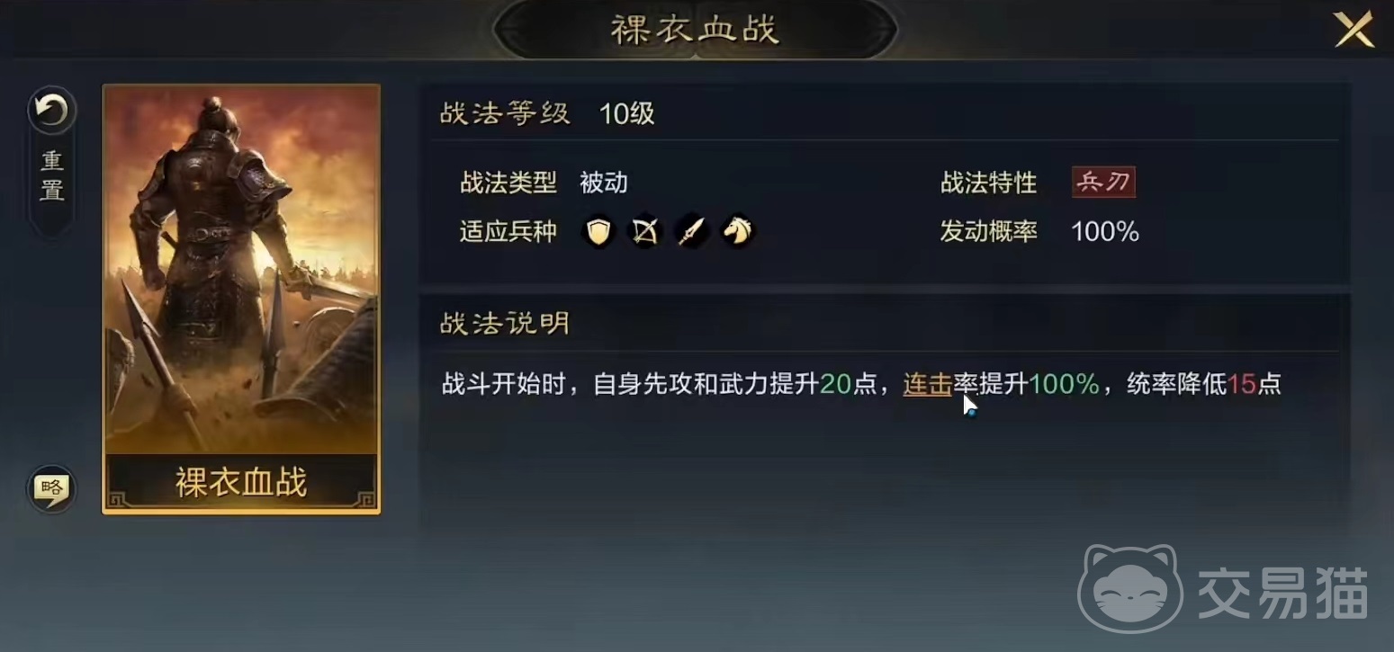 选择锐不可当是为了获得提供的破甲,以及提高自身造成的伤害,这样反击也可以享受到,普通攻击也能享受,伤害提升很明显。许褚自带的战法裸衣血战,在战斗开始时提高自身武力和先攻,获得100%连击率提升,以降低统帅为代价,换来连击输出,也是现在很好用的前排角色。