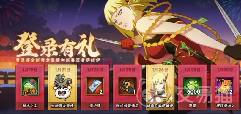 该忍者的获取需要参加登录有礼活动,这一活动在1月26日当天登录并前往活动页面,即可领取新春忍者萨姆伊,萨姆伊也就是萨姆的全程,这是非常好看的一个女忍者,对于喜欢用女角色的玩家是一种福音。