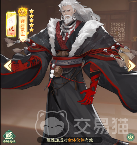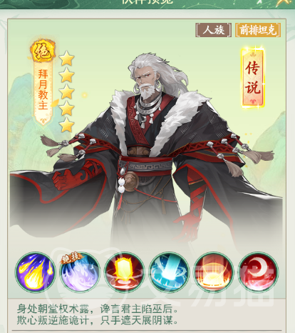 小编要给大家推荐的第一个伙伴是大家非常熟悉的【拜月教主】,这个角色在在游戏中的定位是前排坦克,而且是人族坦克中,十分强势的一个,在攻击的时候,自身的【炎术】可以对单体敌人造成攻击伤害,在面对一些拥有高爆发技能的敌人时候,拜月教主有很高的压制力,在释放绝技【万像真火】的时候,对敌人附加仙术攻击后,可以给自身增加百分比减伤效果!这个效果会持续2个回合!而且当玩家们后期强化拜月教主之后,还可以获得一个属性加成,这个属性加成可以永久提高自身的防御能力!