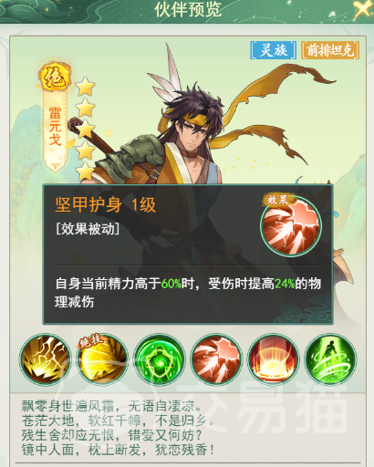 第二个前排伙伴推荐大家选择游戏中十分万金油的【雷元戈】,这是一个灵族成员,在游戏中属于五星伙伴中承伤能力最不错的了,但是相对的,通过基础的技能以及属性被动上来看,雷元戈自身的输出能力就不太行了,所以大家如果选雷元戈作为队伍中的前排来进行使用的话,那么就可以放心的搭配几个爆发输出高的职业是最好的选择!雷元戈的玩法也十分的简单;自身的基础技能【怒雷斩】在对敌人进行攻击时,可以对单一敌人造成伤害!搭配上效果被动,可以在初始阶段,精力值很高的时候,触发一个百分比物理减伤效果!