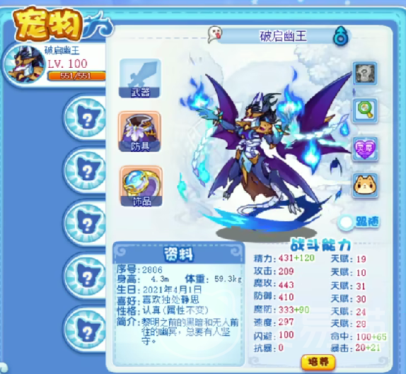 它的输出技能主要是凝灵击,坠魂咒和永夜临,凝灵击可以使玩家们的技能被削减攻击强度,坠魂咒会让幽王在精力较低的时候威力得到大幅度的增加,永夜临可以爆发出很高的伤害。不仅如此幽王还拥有一些特殊的复活能力,在损失一定比例的pp值之后可以复活,但一般这种情况是用来保命,而不是表示幽王会继续战斗。玩家们想要击败幽王的话,可以首先挑选能够减少对方负面影响的宠物,或者是佩戴相应能够克制敌方的技能。