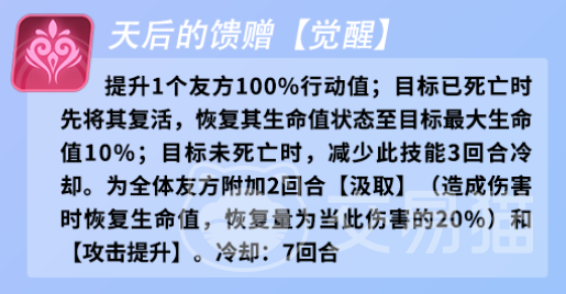 阿尔比尔的最大亮点是她的觉醒技能,这个技能可以在发动后为友方一个单位提升100%的行动值,这意味着该单位可以立即获得一个回合,拥有绝对的先手优势。这个技能可以用来打断敌方的技能,或者给我方的核心输出角色创造更多的输出机会。而且,如果在提升期间该单位死亡的话,还会触发另一个效果,这个效果可以让我方全体获得一个吸血buff,这个buff可以让队伍中的其他成员在攻击时回复生命,增强了队伍的生存能力。