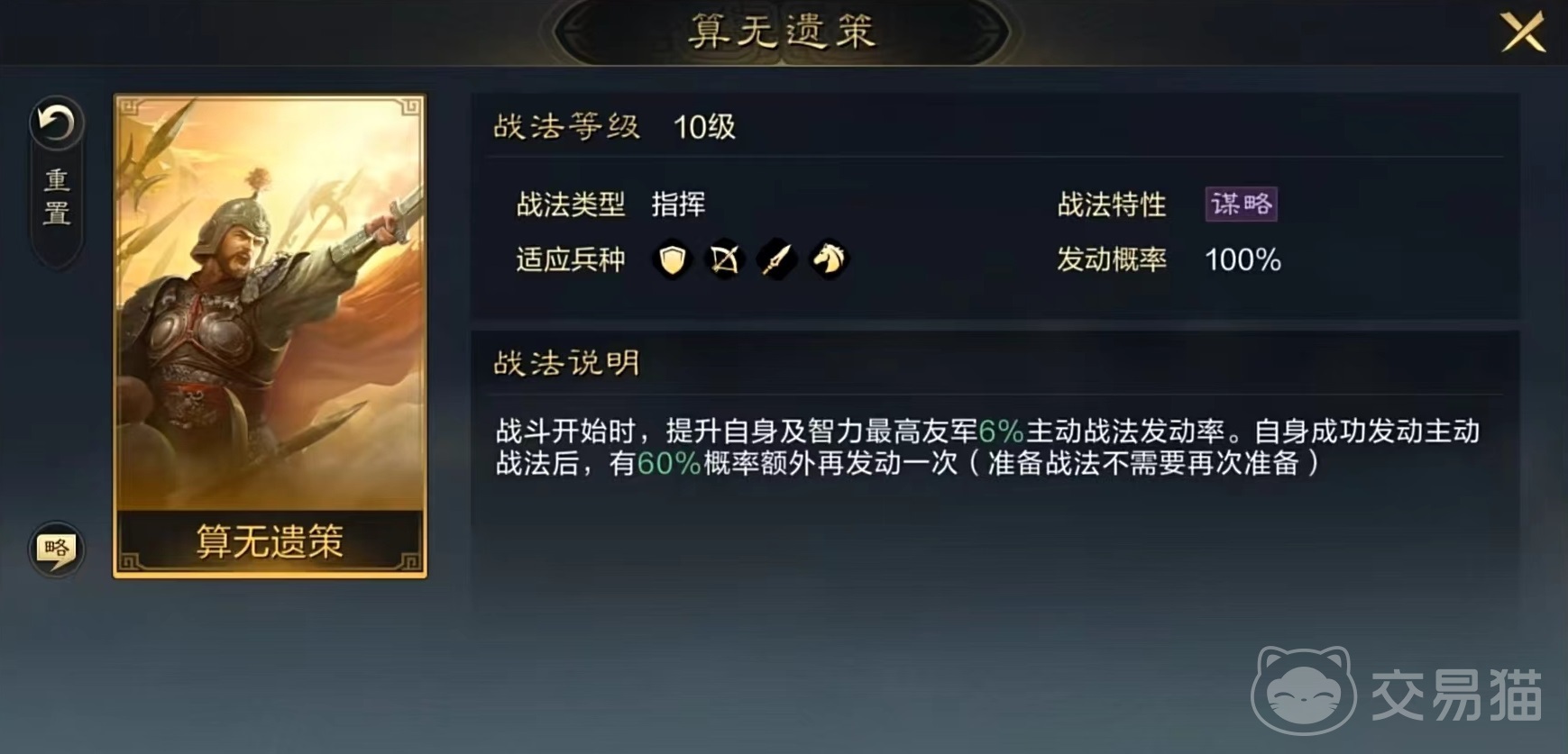 郭嘉自带战法算无遗策,属于指挥类型,100%发动,在战斗开始时为郭嘉自身以及智力最高的友军提高战法发动率,当自身成功发动主动战法后,还有60%几率额外再发动一次。这对于依靠技能吃饭的很多智力型武将来说都是很高贵的。这一技能虽然没有伤害,但是给其他技能释放打造良好基础,所以在后续配合的时候,都会选择另外强势输出技能,这样可以弥补伤害不足的缺陷。