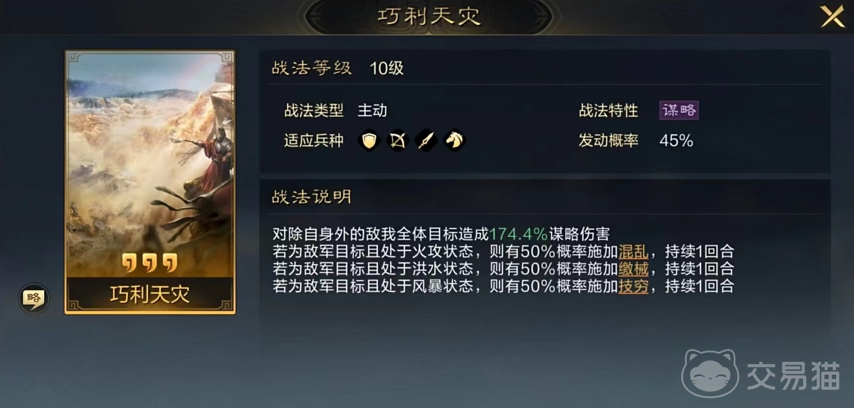 在战法搭配方面,巧立天灾是很适合郭嘉所选择的,效果是除自身之外,敌我全体目标都会受到一次等同谋略伤害,如果当前敌军处于火攻状态,有几率添加混乱,如果敌军处于洪水状态,有几率添加缴械,如果处于风暴状态,则有几率添加技穷。至于这些不同状态的来源,可以通过技能来添加,所以狂风大作、烈火焚营地等都是必选项。如此多的技能,郭嘉自身肯定不能全部学习完,这就需要队友来提供辅助,在阵容搭配方面。目前最出色的当属曹操、郭嘉和贾诩的配合,这三名都属于魏国阵营,所以也算是国家队。曹操优势大家都很清楚,是现在魏国绝对核心,有了曹操这样的大盾牌在前面吸收伤害,郭嘉和贾诩可以在后面放心输出以及释放各种技能。