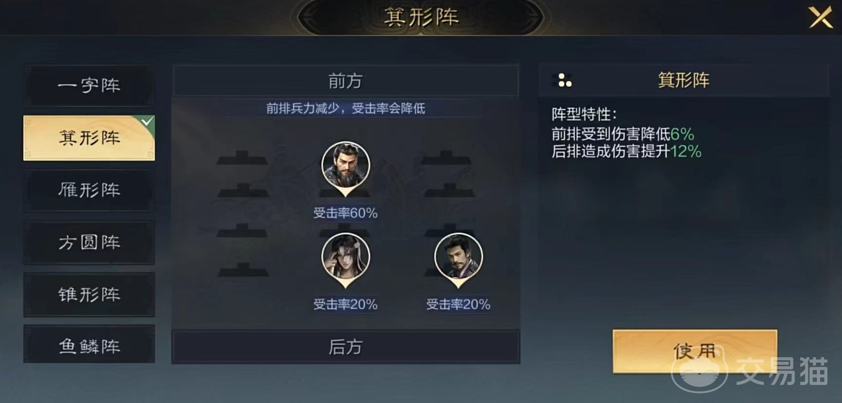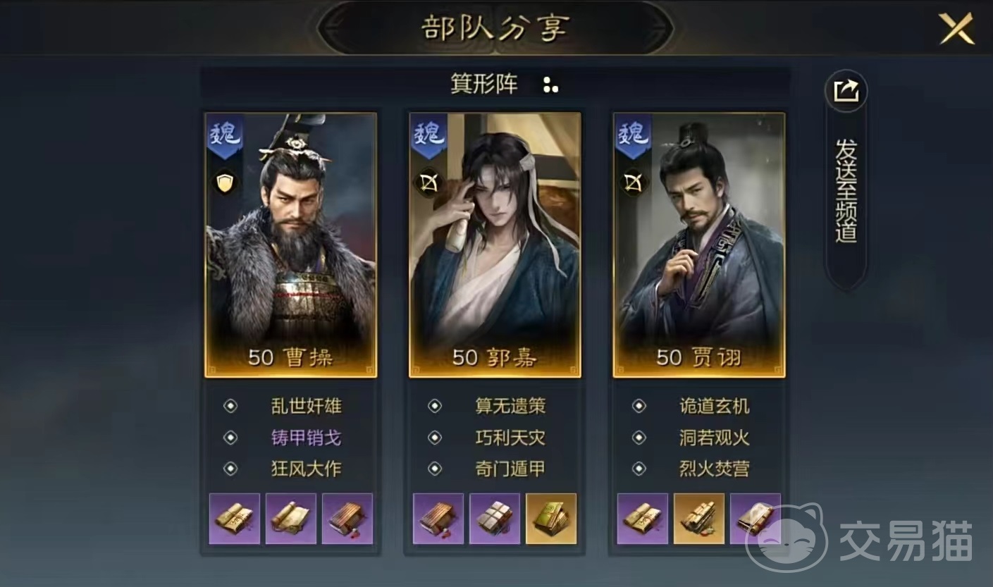 阵型方面当然是曹操放到前排,郭嘉和贾诩在后排,选择箕形阵,这样前排受到伤害降低,后排造成输出提高,将这两名谋略型武将高智力充分发挥出来。虽然不会有太过暴力的爆发,但胜在持久,并且各种不良状态多,这样即使遇到战力较高的敌人也可以拼一下。