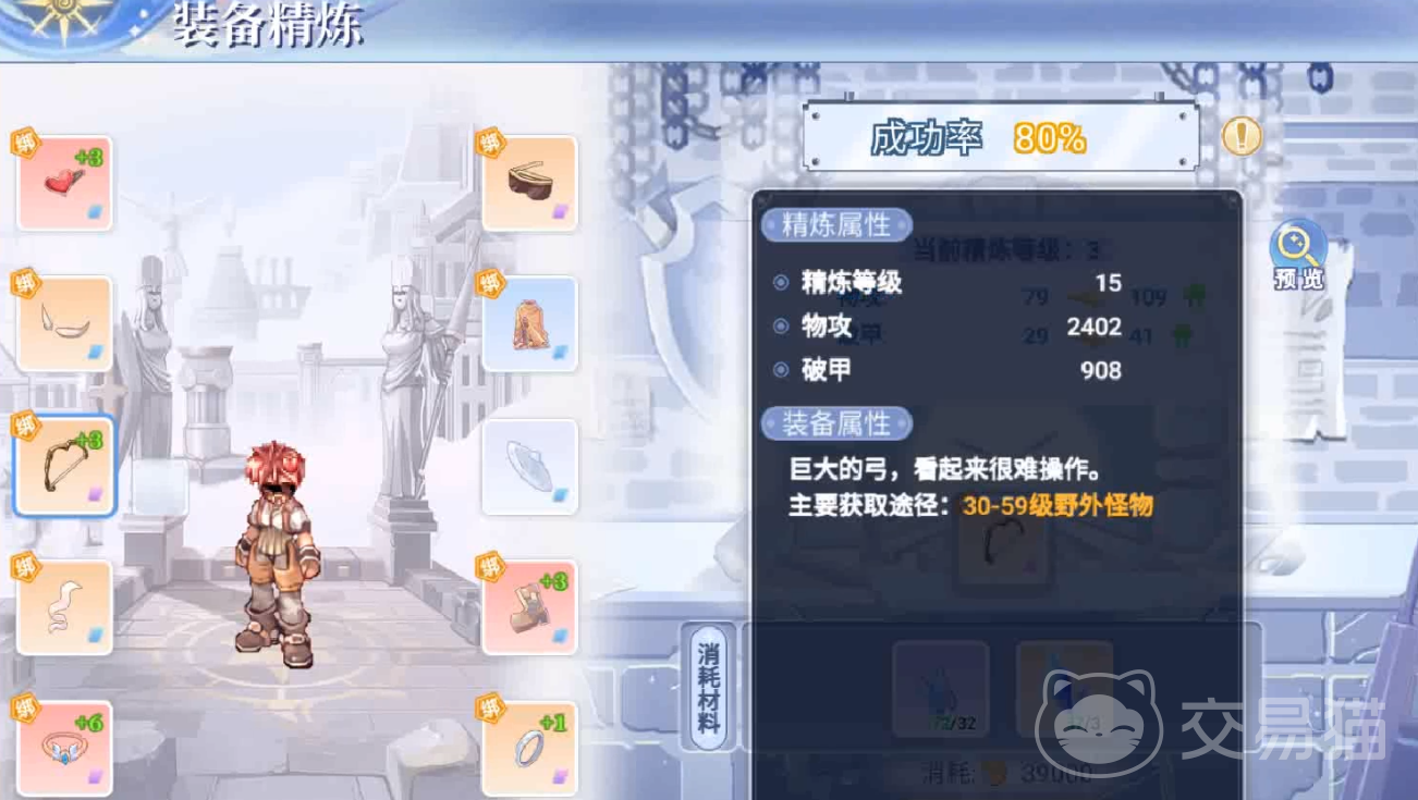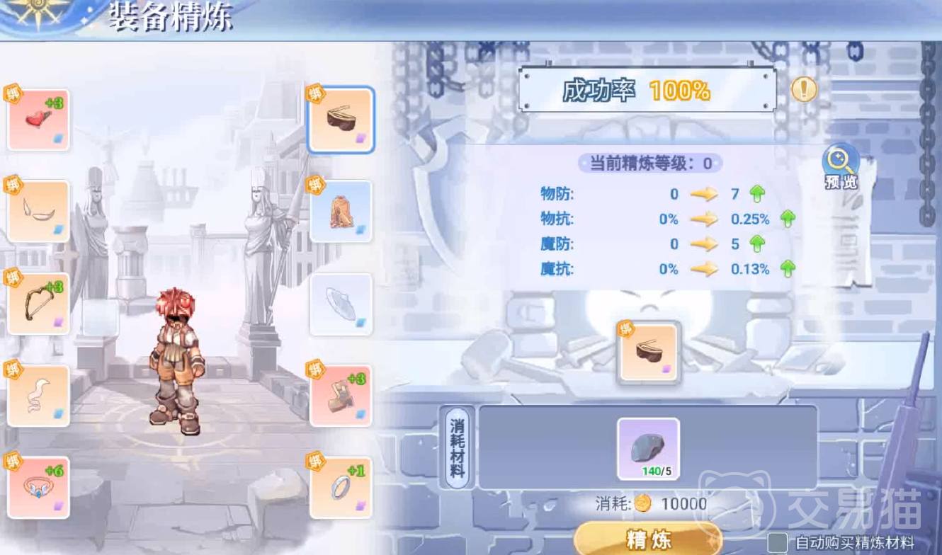 选择想要提升装备经验等级的部位后,需要消耗金币与对应精炼等级的精炼材料。材料的种类大致分为:主副手武器需求神之金属、防具需求铝、饰品则是魔力石。