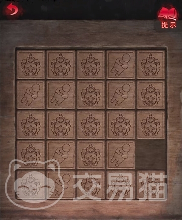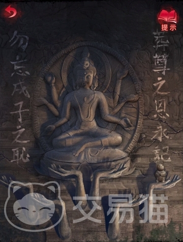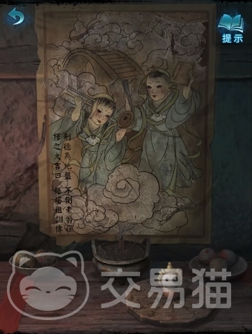 9、回到奚家,在桌子上放置【布帛】,用【加热的熨斗】进行熨烫,获得【帛画】,将【帛画】放置子阿这个位置,获得一个灵塔机关,从下往下按,要将6个佛像全部按出来才能解谜成功。