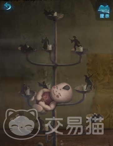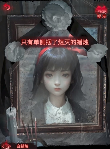 7、回到走廊上,还有一个被锁上的门,放置【照片】,出现解谜线索,根据线索摆放物品;打开房间,获得道具【蜡烛】;