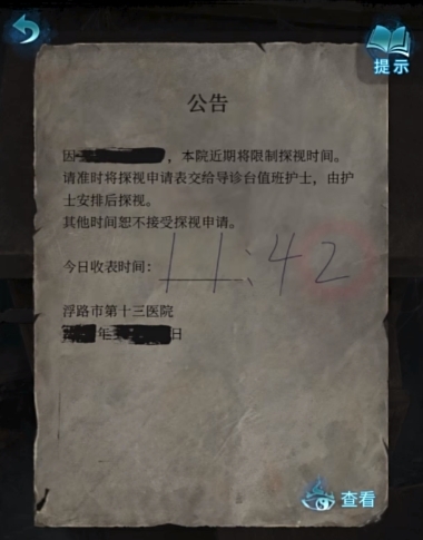 9、把【八音盒】放置在房间内的蜡烛圈内;把【申请表】放到床头的缺失照片的申请表上,获得全新的【申请表】;触发剧情,打开第二个房间内,出现了新的病号服木偶,从它的眼睛里获得保险柜的密码转动顺序;