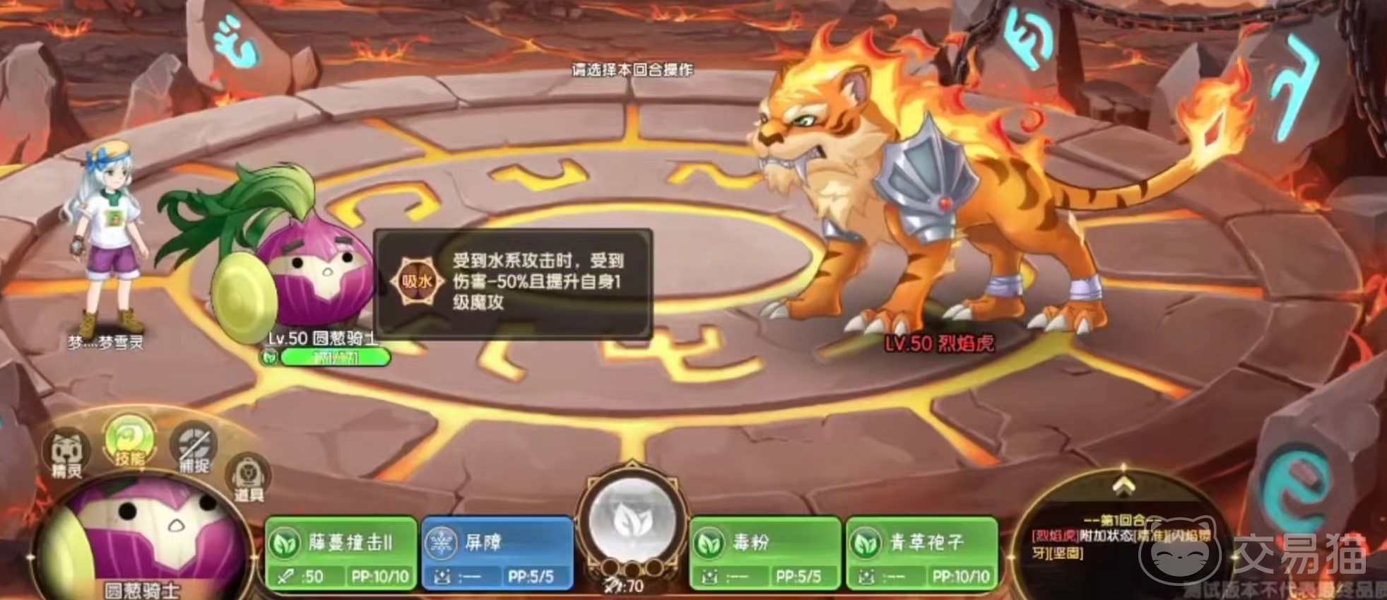 为了应对boss的这些特点,小编选择的是先由圆葱骑士出战,出战之后是首先使用技能毒粉,对方中毒后就会掉血,然后在毒粉效果还存在的时候释放技能青草孢子,这样伤害就足够了。如果毒粉效果消失,后续就补上,此时要注意大招和进化都要存起来,最后关头由帝王斯内克出场,直接开启进化和大招,这样就能快速清理掉了。之所以最后选择帝王斯内克,是因为这是水系宠物本来就克制火系烈焰虎,再加上自身魔攻输出非常出色,可以快速完成击杀。